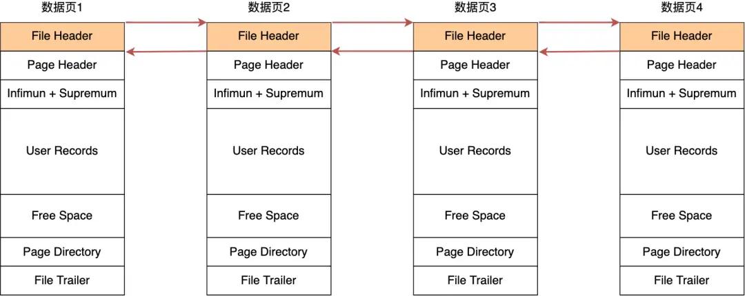 在文件头中有两个指针,分别指向上一个数据页和下一个数据页,连接起来的页相当于一个双向链表:
