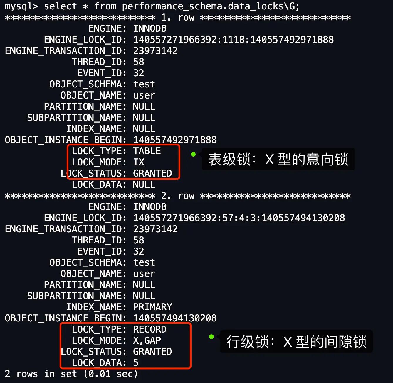 我们可以通过 select * from performance_schema.data_locks\G; 语句来查看事务执行 SQL 过程中加了什么锁