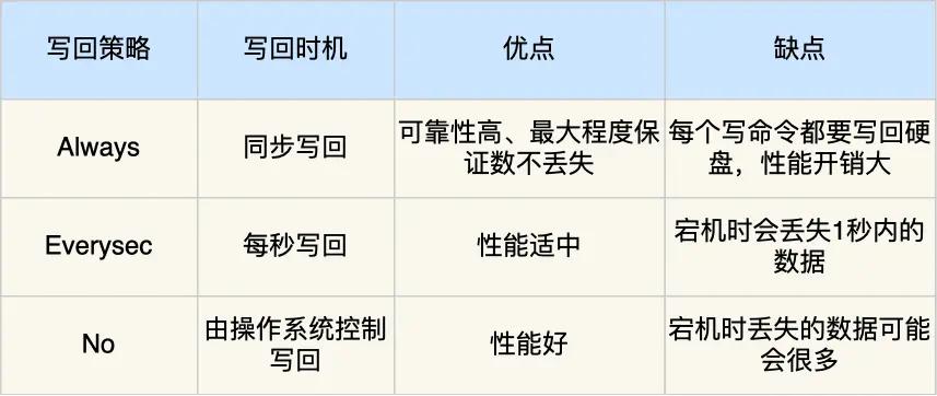 - Always:每次写命令之后,同步将 AOF 数据写回硬盘